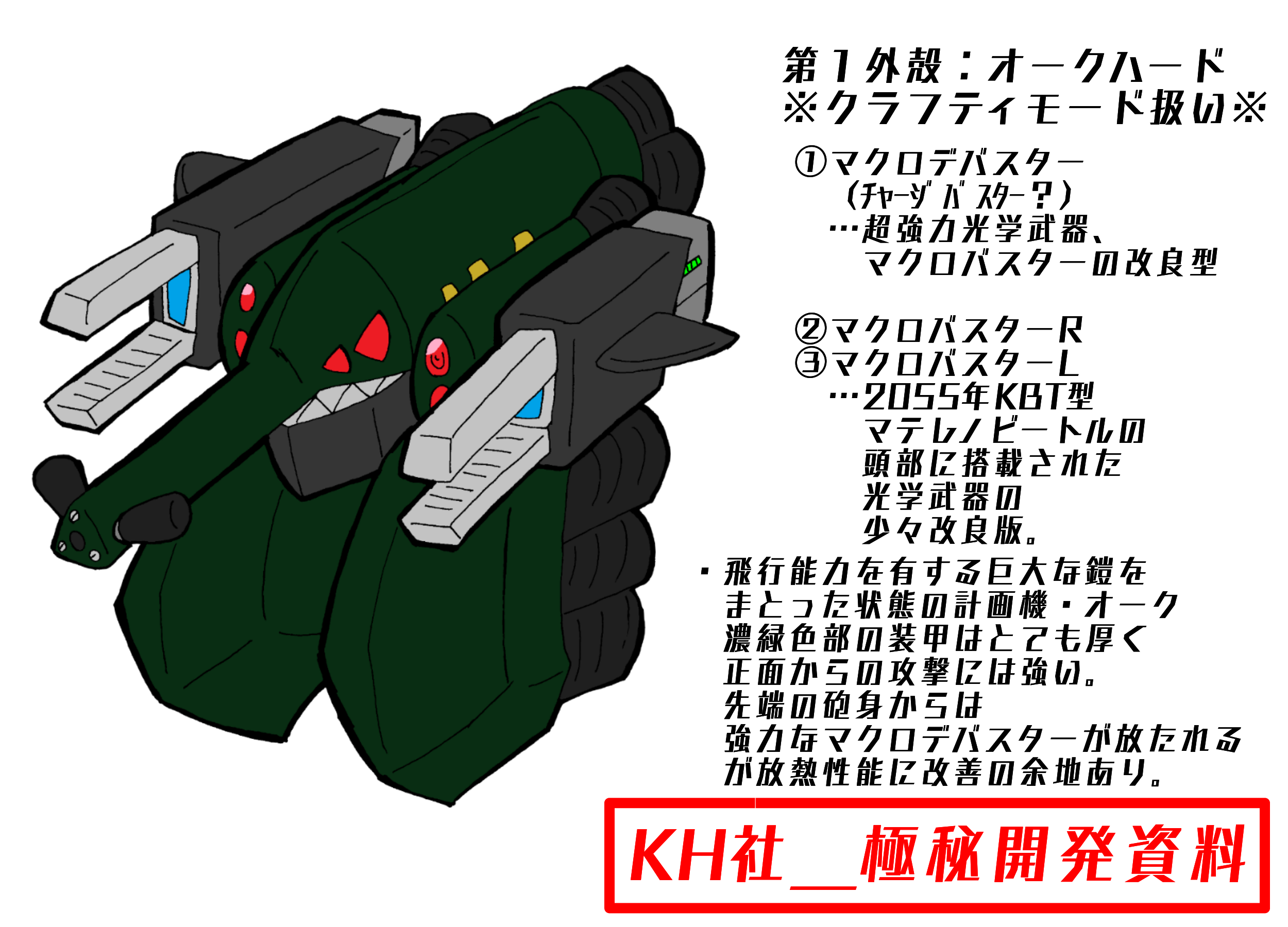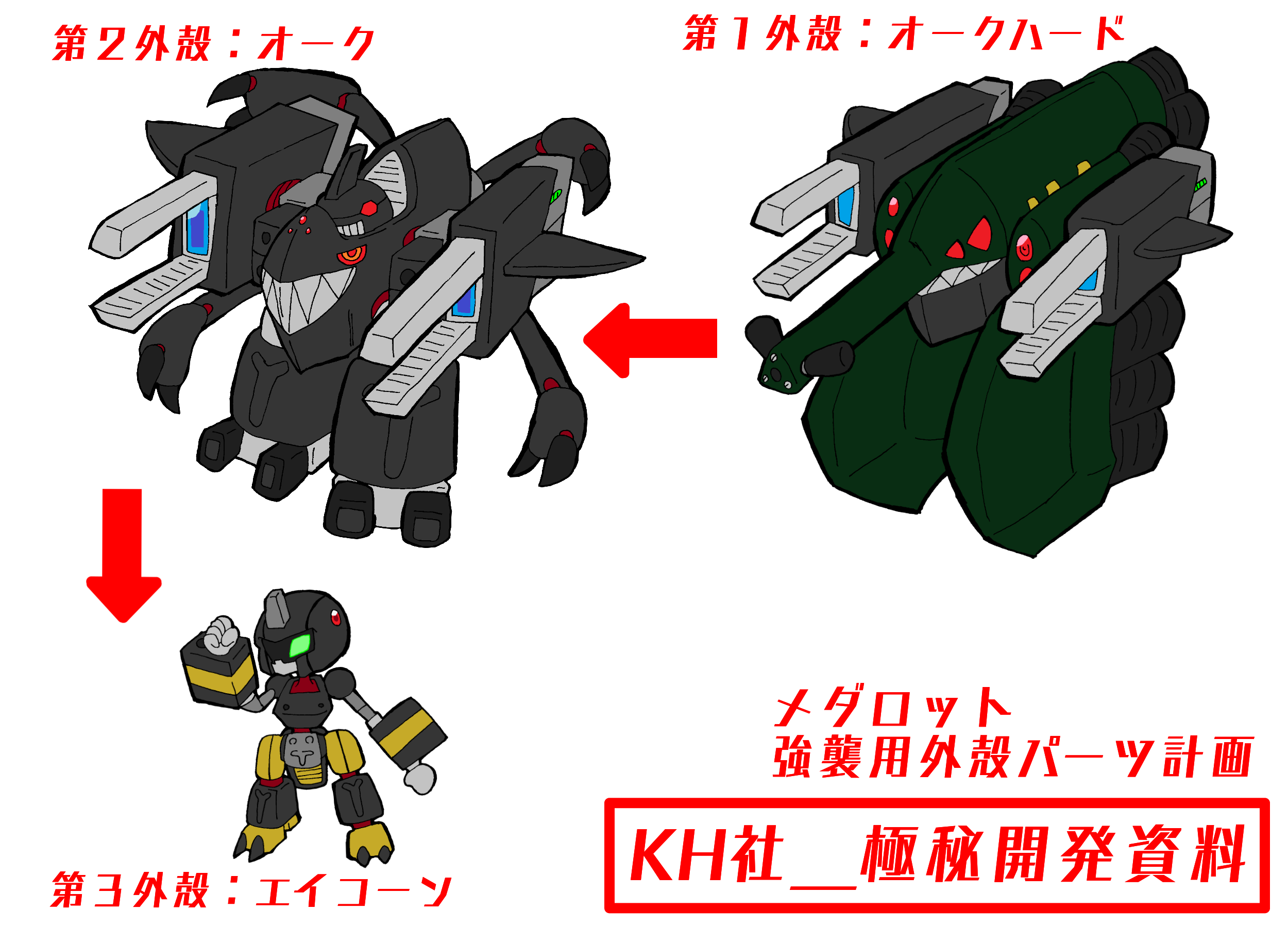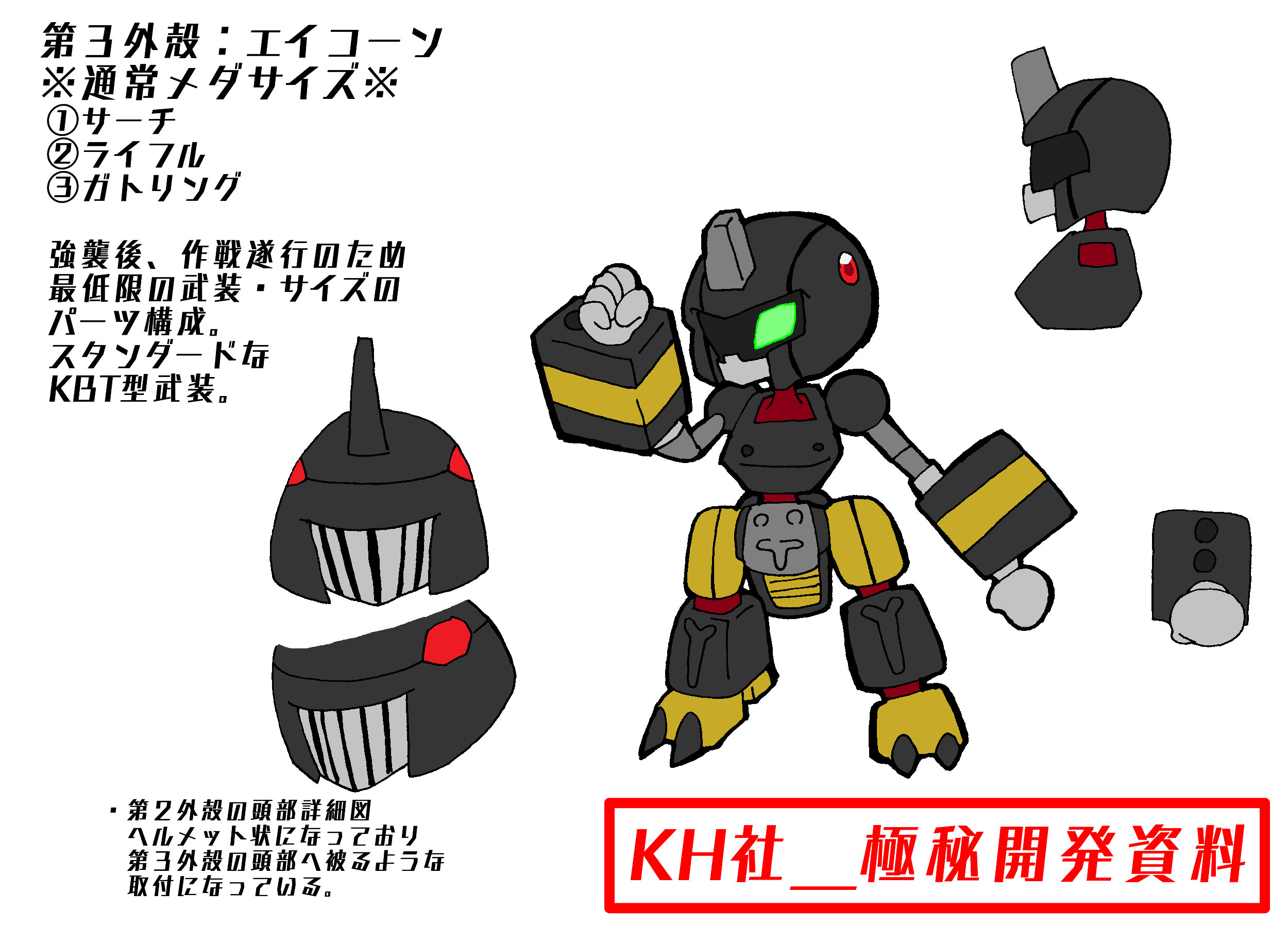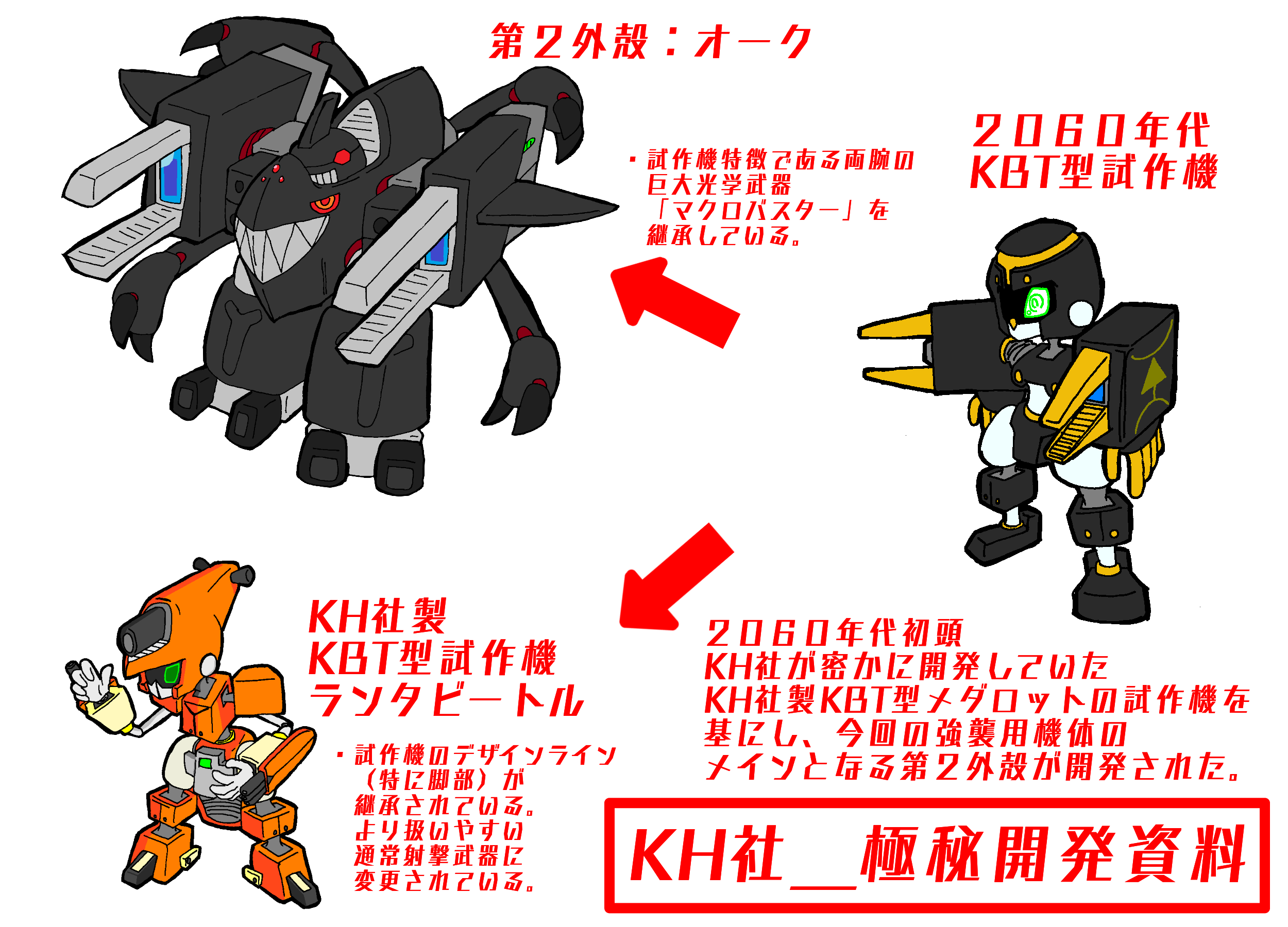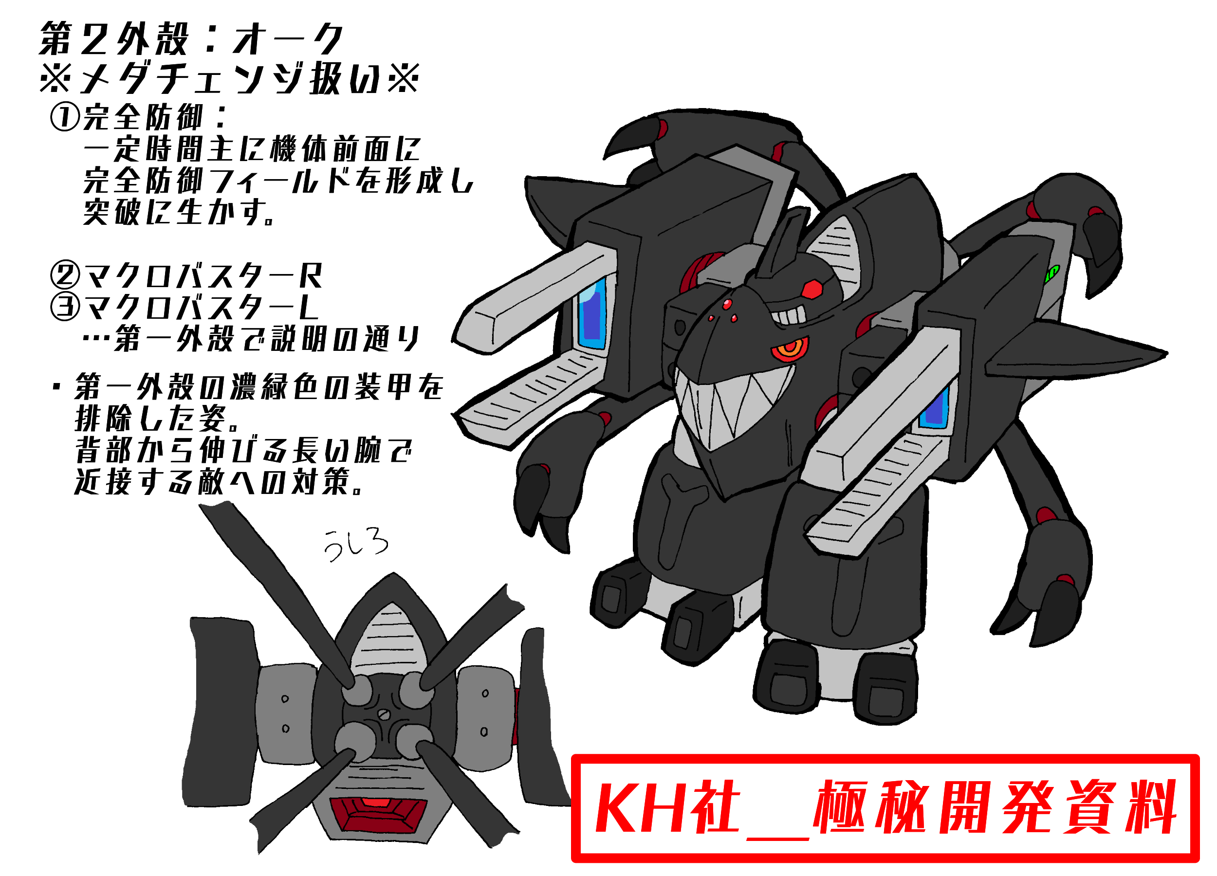 × [PR]上記の広告は3ヶ月以上新規記事投稿のないブログに表示されています。新しい記事を書く事で広告が消えます。 どうも。SOHITです。 オリメダ作品 メダNFχ、ご覧いただけましたでしょうか? まだの方はぜひ。 https://www.nicovideo.jp/watch/sm36598948 さて、本編中に登場した機体について、 KH社より極秘資料を入手したので こっそり公開いたします・・・! (クリックで拡大できます) ということでKH社が極秘で開発した 一般に販売されていない特殊な機体になります。 タカのパートナー・クヌギが装着。 マザー奪還の為、Dカンパニーへ突入する際に 使用しました。 第1外殻状態で出撃しました。 各装甲を「外殻」と呼びます。 なんとなくです。木の実的な。 (クリックで拡大できます) そもそもこの強襲用パーツがどのようにして開発されたか… 上記の資料にある通り、KH社製メダ開発時、 KBT型試作機が開発されましたが 強力な武装のため、市販には向かないと判断されました。 その後、NFにも登場した「ランタビートル」を試作の主軸としましたが、 最初期の試作機から排除された高威力武装のノウハウを 今回の強襲用パーツのメインに流用しました。 では各外殻の説明になります。 (クリックで拡大できます) まずは第1外殻です。 飛行パーツとなります。 先端の強力な光学武器「マクロデバスター」は 2055年代KBT「マテレノビートル」に搭載されていた 「マクロバスター(初期版)」の改良型になっています。 市販も考えていないため、搭載できる最大限の威力に設定されています。 そのため、今回の使用時も不具合が発生していました。 改良の余地あり、です。 (クリックで拡大できます) 続いて第2外殻です。 こちらも飛行能力を有していますが 第1外殻ほど長距離飛行には向いていません。 しかしより戦闘向きとなっています。 背部の長い腕は近接戦闘を 両腕のマクロバスターは遠距離戦闘を可能にします。 (クリックで拡大できます) 最後に第3外殻です。 こちらは通常メダのサイズになります。 強襲し、施設内部に入ることを想定したパーツです。 最低限の武装でスタンダードなKBT型パーツです。 と、以上こんな感じです。 ……秘密ですよ? あと、 KH社のロゴ、ご存じの方はご存知かと思いますが… これです。 これってどういうマークなの? という聞かれる機会があったので なりたちはこんなかんじですよ~。 (クリックで拡大) こうです!(?) 以上です! それでは、また! PR どうも。SOHITです。