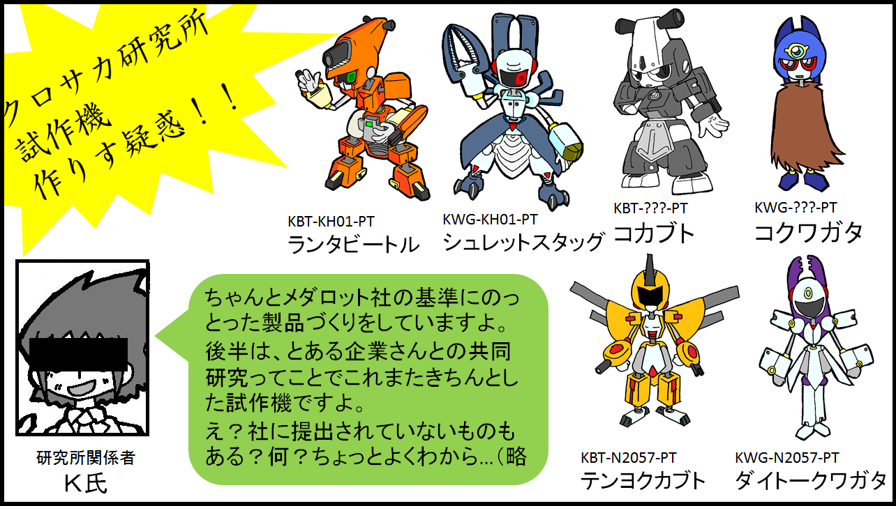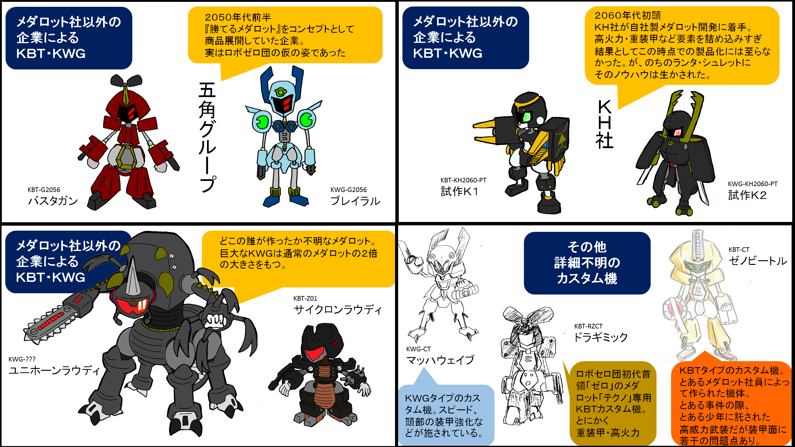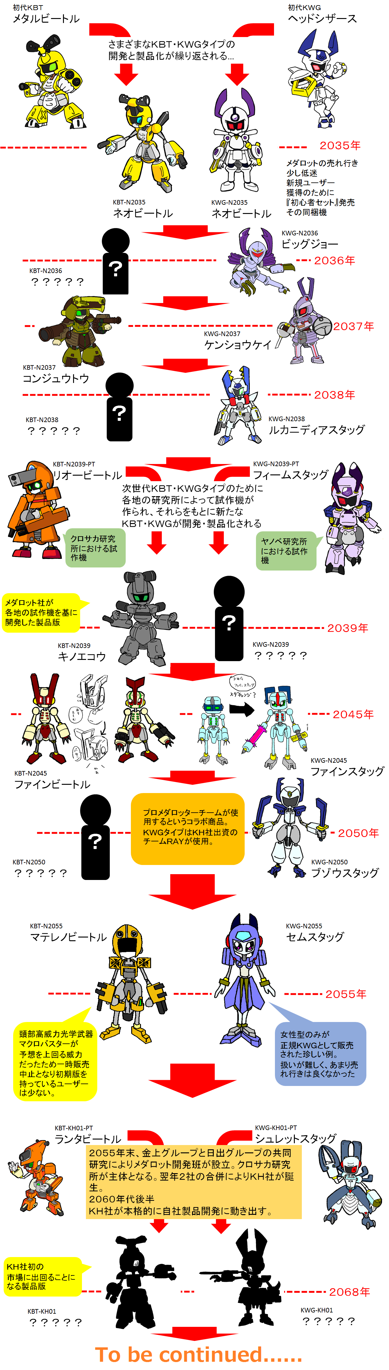 みなさま、メダロット8楽しんでますでしょうか? 楽しいですよね。日々メダロット漬けで幸せです。 さて、今回は メダロット8DLC第二弾で発表された興味深い機体があったので、 それに影響を受けつつ メダロットNature世界におけるKBT・KWGについて 少し解説じみたことをしていきたいと思っております。 『Nature世界のKBT・KWG変遷の歴史』 ※クリックで最大化し、ご覧下さい※ ここまでがメダロット社、 並びにKH社が関わったKBT、KWGでした。 端的に言うと主人公たちが使っていた機体、 それに関わる機体でした。 空白もありますが……それはまた別の機会に。 次はそれらとは少し異なるKBT・KWGです。 ※クリックで最大化し、ご覧下さい※ いろいろです。カスタム機についてはNature以前の時代のお話です。 見たことあるけど活躍を見ていない機体は いつの日か作品内に登場する…かも? ※クリックで最大化し、ご覧下さい※ ・・・・・・・・・まぁよくよく考えると変ですねっていうお話。 とりあえずこんな感じです。 まぁ、ちょっと知ってたらよりNatureシリーズを楽しめるかも? くらいの内容です。あしからず。 それでは、また! どうも。
