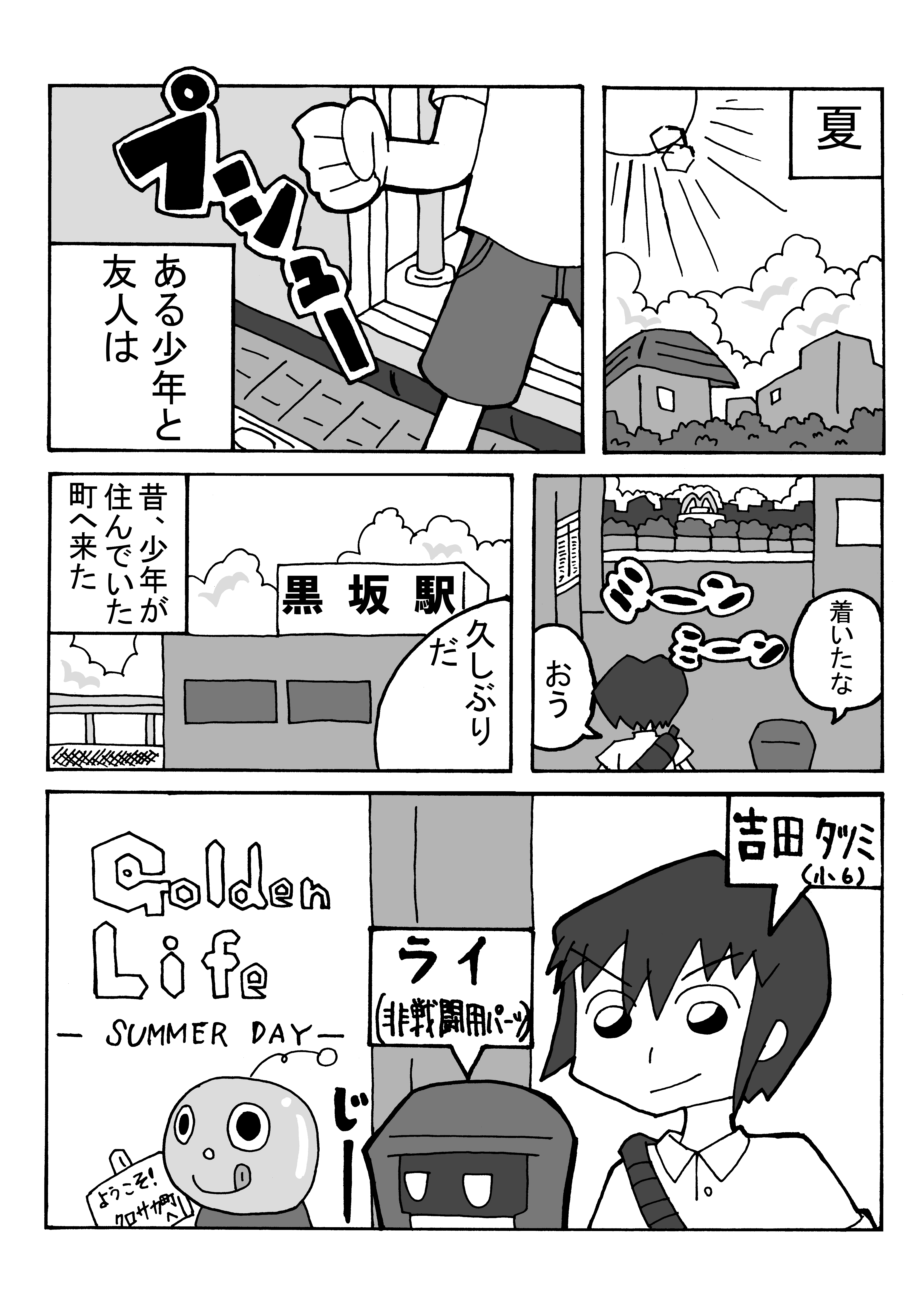 今年もよろしくお願いします。 あっ という間に2014年始まってました。 ブログの更新は手が付きませんでしたが、 Nature 5周年記念企画のもろもろは無事完結しました! これもひとえに、応援してくださった皆様、 協力してくださった皆様、そう、皆様のおかげです。 ありがとうございました! さてさて、5周年記念企画、すこーし振り返ってみましょう。 まずは5周年序章、ということで公開した 【メダロットNature A話】 http://www.nicovideo.jp/watch/sm20162649 http://www.pixiv.net/member_illust.php?mode=medium&illust_id=33778723 Q話や今後のNatureシリーズに関係しそうな要素をちりばめた Nature番外編。Natureより数年前のお話でした。 そして5周年連動企画として開始した、 Natureとは異なるオリメダストーリー 【Golden Life】 http://www.youtube.com/watch?v=k28i0-moaK8 http://www.pixiv.net/member_illust.php?mode=medium&illust_id=34197397 Natureより一年前の世界。 しかしほとんどNature登場人物は登場せず、 まったく独自の展開を予定しております。 そして5周年前夜のそれまでtwitterに投稿していた 就寝前Natureメンバーのイラスト集 【おやすみ絵まとめ】 http://www.pixiv.net/member_illust.php?mode=medium&illust_id=36049383 を経て、いよいよ6月1日、メダロットNatureは5周年を迎え、 新たな物語が展開されました。 それが…… 【メダロットNature Q話】 http://www.nicovideo.jp/watch/sm21006022 2038年、最後の旅。 不思議な出会いと別れを描いた物語。 12パートで構成。1パートずつ更新され、 久しぶりの不定期ではあるものの、長期更新ものとなりました。 Q話の更新とともに動いていた計画、 それは5周年を記念した、Natureのリメイクでした。 そして、11月3日、東京で行われたメダオンリーイベント MEDA-EXPO 2013(http://meda-expo.jpn.org/2013/)にて SOHIT初となる、サークル参加を果たし、DVDを頒布しました。 【メダロットNatuRE】 ニコニコ動画で公開中の「メダロットNature」を 全編描きなおし、DVDとして形にしたもの。 追加場面や、新規ストーリー、 そして、豪華メダロッター陣による Nature5周年記念イラスト集など 豪華豪華の豪華三昧! ほんとうにありがたかったです。 感謝してもしきれない。 また、オンリーイベントで頒布された スーパーロボトル大戦.に Golden Lifeの番外編も載せていただきました。 【Golden Life -SUMMER DAY-】 http://www.pixiv.net/member_illust.php?mode=medium&illust_id=39554782 本編Golden Lifeより一年後、2038年のお話で、 クロサカ町にタツミとライが降り立ちます。 そして、2013年末、12月。 年末スペシャルとして Golden Life -SUMMER DAY-の 動画版:http://youtu.be/IHp4aJLq73c NatuRE特典新規ストーリー 【メダロットNature E話】 http://www.nicovideo.jp/watch/sm22572464 これらを公開。 さらに、Q話を完結 以上が5周年記念企画でした。 こう振り返ってみると 一年で結構やれた気分です。 Natureの過去とその後、 これまでのNature=2038年という もろもろのことへの 一つの区切りでした。 Nature番外編も続きます(多分)。 次やるなら2039年のお話、タカたちが6年生になる年ですね。 Golden Lifeも続きます(多分)。 2037年の詳しいお話。 彼らのとりあえずの終着点がQ話ラストなので そこまでのお話をのんびりと。 次に大きく動くのは、おそらくNF完結編です。 小さくは動いていくと思いますが。 兎にも角にも…… Nature5周年お付き合いくださいました皆様! 本当にありがとうございました! 今後ともNatureシリーズ、sohitともども よろしくお願いいたします! それでは、また! どうも。ブログの更新頻度がちょっと高めなsohitです。 それゆえ、ネタばれ確実なので ちなみに、 ではでは、すこし補足をば。 どうも。寒いです。隙間風が気になりだす季節ですね。 レポート漫画の様なものも描いたので いろんな人に会えました! uniさんのサークル初参加に驚き オンリー後も ・・・と、なにも考えずただひたすら